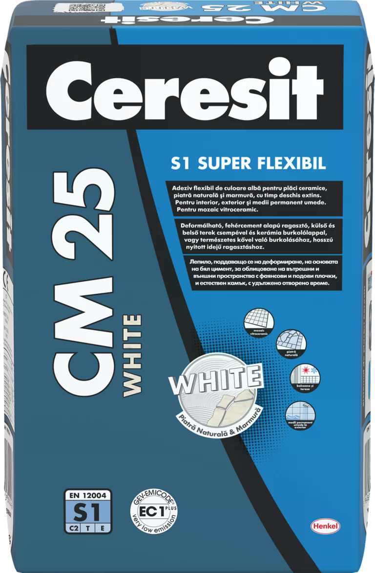 Το CERESIT® CM 25 συνιστάται ιδιαίτερα για την τοποθέτηση γυάλινων μωσαϊκών ή πλακιδίων, όπου απαιτείται ομοιόμορφο βασικό χρώμα, καθώς και για την ανθεκτική στον αποχρωματισμό συγκόλληση ελαφρού και ημιδιαφανούς μαρμάρου και άλλων πλακών φυσικής πέτρας με τη μέθοδο της λεπτής στρώσης. Το CM 25 είναι κατάλληλο για την τοποθέτηση διαφόρων πλακιδίων (κεραμικά, πέτρα, φυσική πέτρα) και γρανίτη σε ευαίσθητα υποστρώματα.