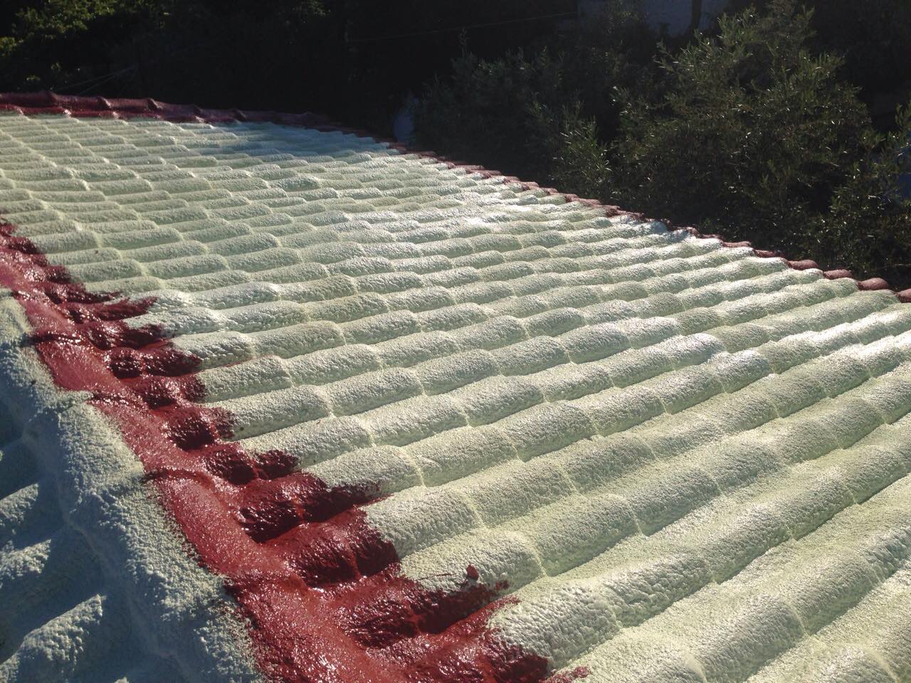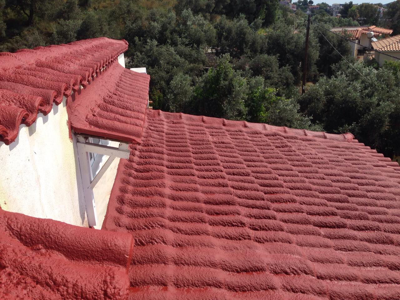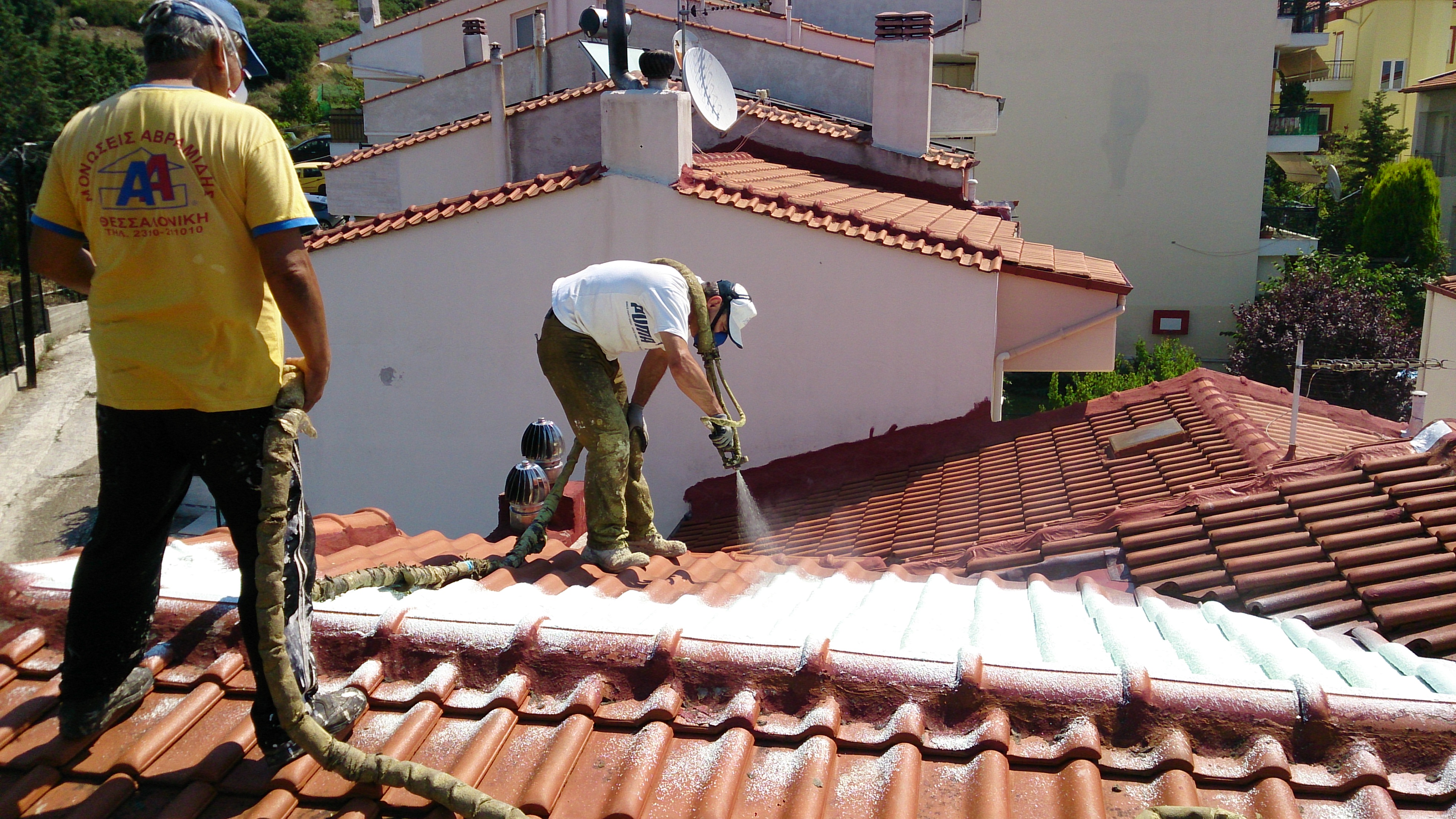 Στην πρώτη περίπτωση της εξωτερικής θερμομόνωσης ψεκάζεται ο αφρός πολυουρεθάνης στα κεραμίδια από την πάνω μεριά και έπειτα επικαλύπτεται με ειδικά επαλειφόμενα υλικά συνήθως σε κεραμιδί χρώμα για να μην αλλάξει το χρώμα της στέγης. Η πολυουρεθάνη έχει τέλεια πρόσφυση στη στέγη γι' αυτό γίνεται ένα σώμα με αυτή.