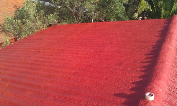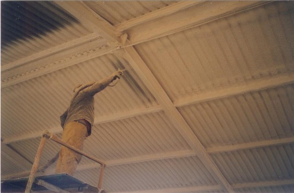 Στην πρώτη περίπτωση της εξωτερικής θερμομόνωσης ψεκάζεται ο αφρός πολυουρεθάνης στα κεραμίδια ή στην αυλακωτή λαμαρίνα από την πάνω μεριά και έπειτα επικαλύπτεται με ειδικά επαλειφόμενα υλικά συνήθως σε κεραμιδί χρώμα για να μην αλλάξει το χρώμα της στέγης. Η πολυουρεθάνη έχει τέλεια πρόσφυση στη στέγη γι' αυτό γίνεται ένα σώμα με αυτή.